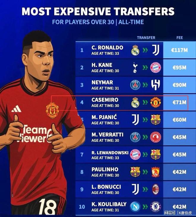 皇马对于卡塞米罗主动想走的诉求是在第一时间就应允的,因为曼联提供了一份7100万欧元的报价,要知道13年买入他时皇马仅仅掏出了600万。这份报价至今也占据着30岁以上球员历史转会费前十榜单的第四名,可谓是性价比拉满的一笔交易。
