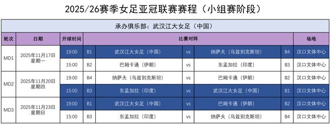 今天,中国足协刚刚发布了《关于2025/26赛季女足亚冠联赛赛程的通告》,确认新一届女足亚冠将于2025年11月开启。作为2024赛季女超联赛冠军暨2024/25赛季女足亚冠冠军,武汉江大女足将代表中国直接进入小组赛,并承办B组赛事,比赛场地为汉口文体中心。